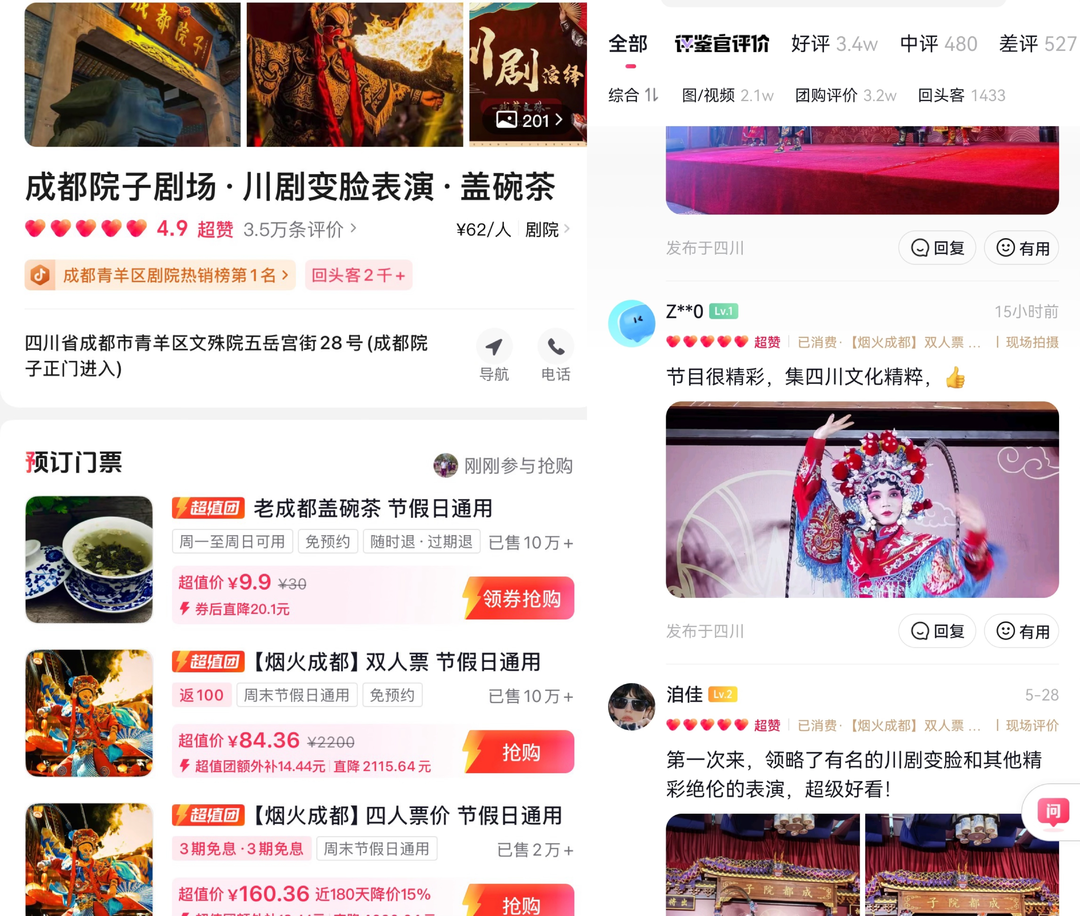 开业两年来,剧场保持着高上客率。其中,抖音的团购订单占至总销售额的百分之九十七八,许多外国游客甚至也拿着抖音团购券来核销。因为抖音的算法推荐,剧场扎实深厚的演出内容精准触达了川渝地区喜欢川剧的人群和来成都旅游的游客,更带来了不少特地慕名而来的新客人。